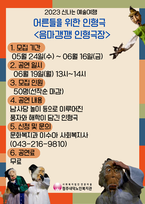 2023년 신나는 예술여행 어른들을 위한 인형극 '음마갱깽 인형극장' 공연을 진행합니다. 아이들만 즐기는 인형극이 아닌 실버 세대를 위한 우리들의 이야기가 담겨 있으며 경기도 성남시의 예술공연 단체인 '연희공방 음마갱깽' 팀이 직접 복지관에 방문하여 공연을 진행해주십니다! 많은 관심과 참여 부탁드리며, 신청 및 문의사항은 아래의 번호로 연락주시거나 복지관 1층 사무실 방문부탁드립니다.