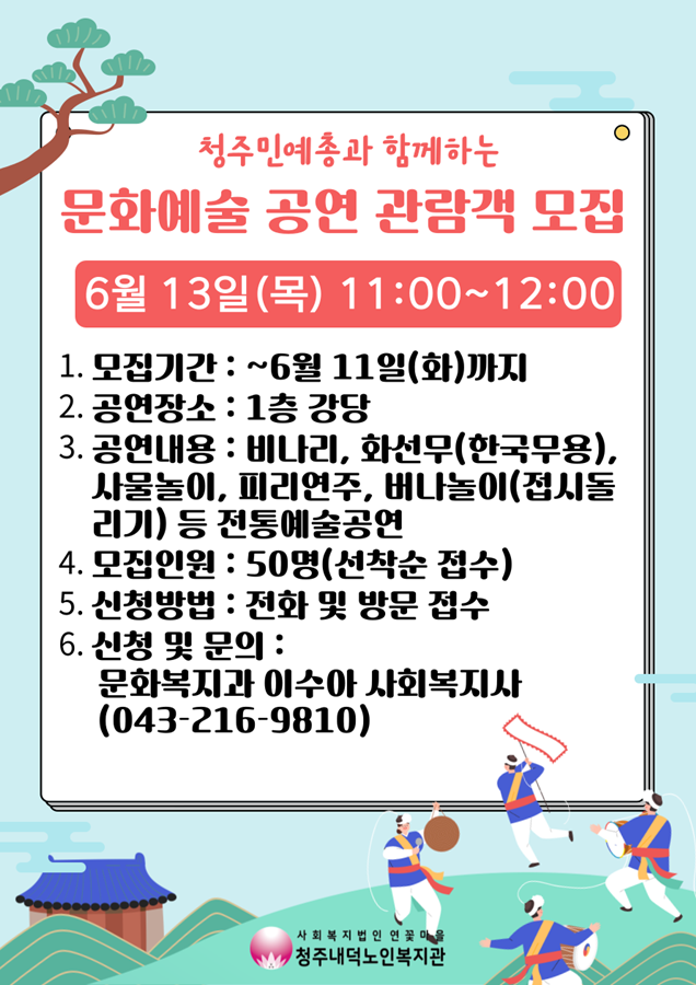 이번 공연은 비나리, 화선무(한국무용), 사물놀이, 피리연주, 버나놀이(접시돌리기) 등 다양한 전통예술공연이 진행될 예정입니다. 선착순 50명으로 관람객을 모집하고 있으니 관람을 희망하시는 분은 6월 11일(화)까지 복지관으로 전화 신청(043-216-9810) 또는 사무실 방문 신청해주시면 됩니다! 많은 관심과 참여 부탁드립니다! |