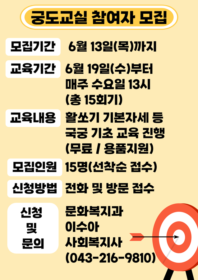 궁도교실이 진행될 예정입니다. 활쏘기 기본 자세 등 국가무형문화재인 활쏘기에 대해 강사님을 통해 배울 수 있습니다 관련 용품도 지원하여 무료로 수강이 가능하오니 신청을 희망하거나 문의가 있으신 분은 사무실 방문 및 전화로 문화복지과 이수아 사회복지사(043-216-9810) 찾아주세요 많은 관심과 참여 부탁드립니다! |