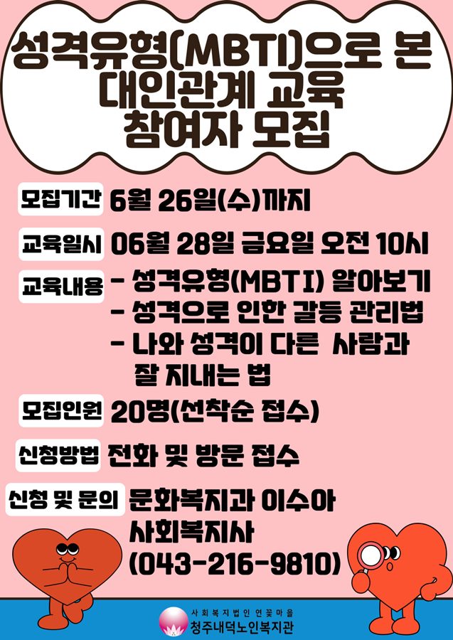 이번교육은 청주시평생학습관에서 지원받은 찾아가는 청주시민학교 교육의 일환으로 전문 강사님과 16가지로 나뉘는 성격유형 MBTI에 대해서 알아보고 나와 성격이 다른 사람과 잘 지내는 법 등 대인관계에 대해 알아보는 시간을 가집니다. 20명 선착순으로 모집하고 있으니 신청을 희망하거나 관심 있으신 분들은 복지관 사무실 방문해주시거나 복지관에 전화로 문화복지과 이수아 사회복지사 (043-216-9810) 를 찾아주세요 많은 관심과 신청부탁드립니다! |