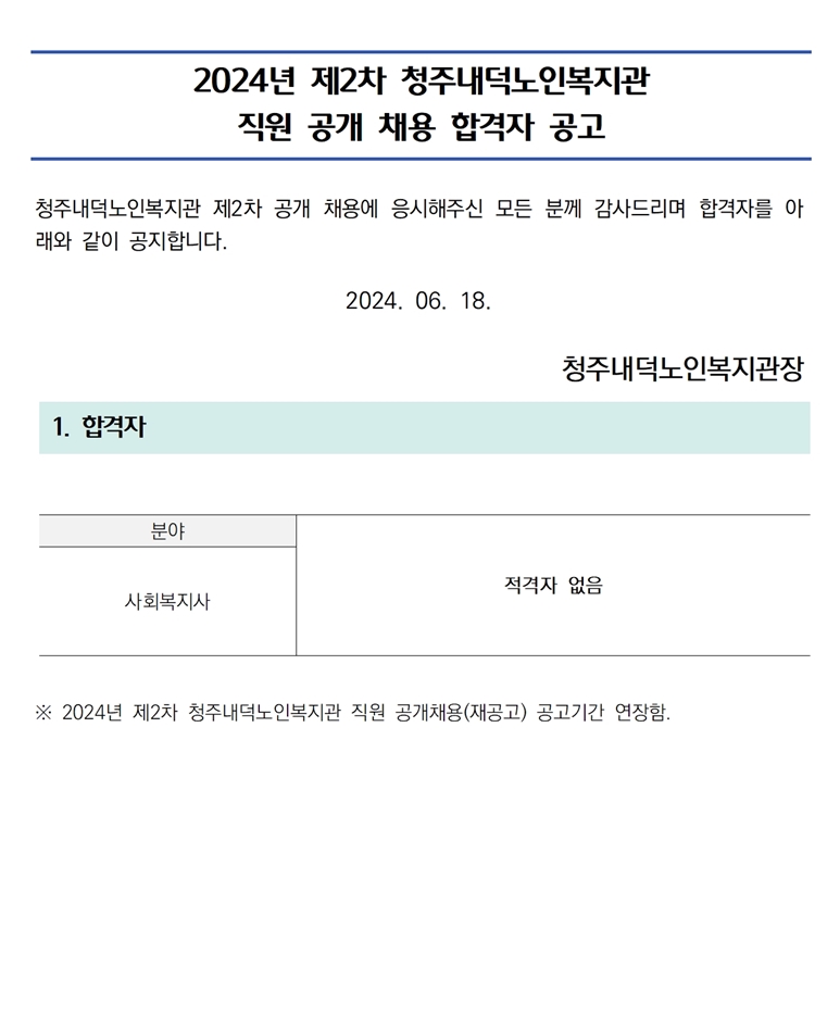 | 2024년 제2차 직원 공개채용 서류 합격자 발표(적격자 없음) | |||
