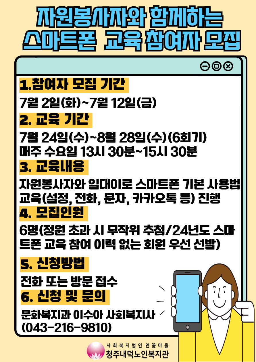 복지관에서 7월 12일(금)까지 자원봉사자와 함께하는 스마트폰 교육 참여자를 모집합니다. 7월 24일(수)부터 8월 28일(수)까지 매주 수요일 13시 30분~15시 30분에 진행하며, 자원봉사자와 일대이의 방식으로 스마트폰 기본 사용법 교육을 진행합니다. 관심있으신 분들은 전화 또는 사무실 내방하여 신청해주시면 됩니다. 많은 관심과 참여부탁드립니다! |