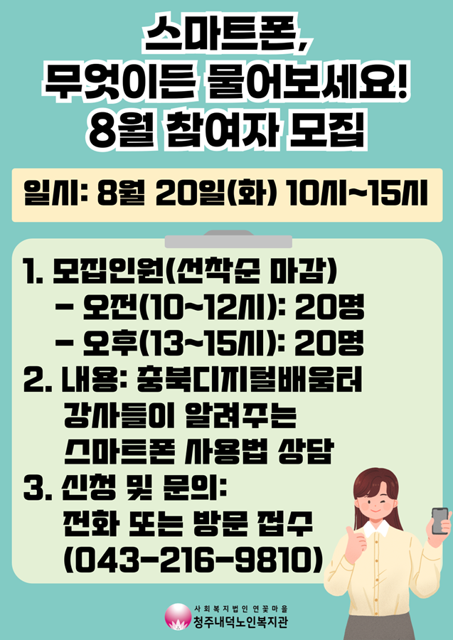 10~15시에 스마트폰 무엇이든 물어보세요가 진행예정입니다. 충북디지털배움터 강사님들이 이용자들의 스마트폰에 대한 궁금증을 해결해주실 예정입니다. 평소 궁금한게 있었지만 교육에서 다뤄주지 않았거나 스마트폰 사용법에 대해 궁금한게 있으신분들은 신청하셔서 상담받아보시면 도움이 되실겁니다. 이번 스마트폰 무엇이든 물어보세요는 이번 8월부터 11월까지 매월 넷째주 화요일에 진행 예정이며, 9월부터는 별도의 사전 신청 없이 관내 이용자분들이 실시간으로 상담받으실 수 있도록 할 예정이니 많은 관심과 참여부탁드립니다!