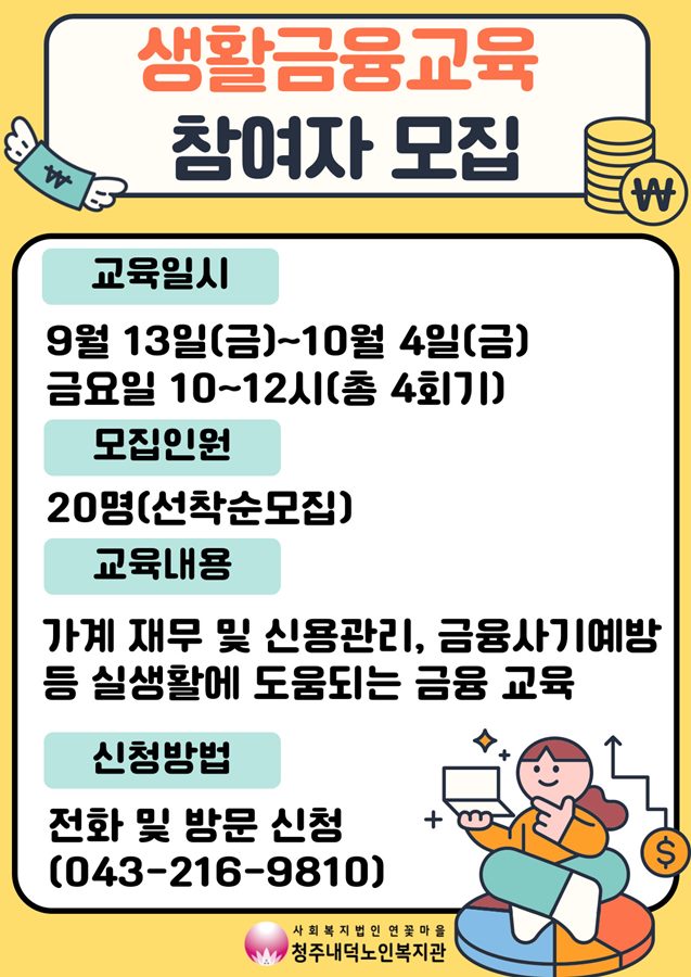 9월 13일(금)부터 10월 4일(금)까지 총 4회기동안 매주 금요일 10~12시에 복지관에서 생활금융교육이 진행됩니다. 이번 교육은 예금보험공사의 지원으로 전문 강사님이 오셔서 가계재무 및 신용관리, 금융사기 예방 등 실생활에 도움이 되는 금융 교육을 진행해주실 예정입니다. 복지관 사무실을 방문하여 신청해주시면 됩니다. 많은 관심과 참여 부탁드립니다!