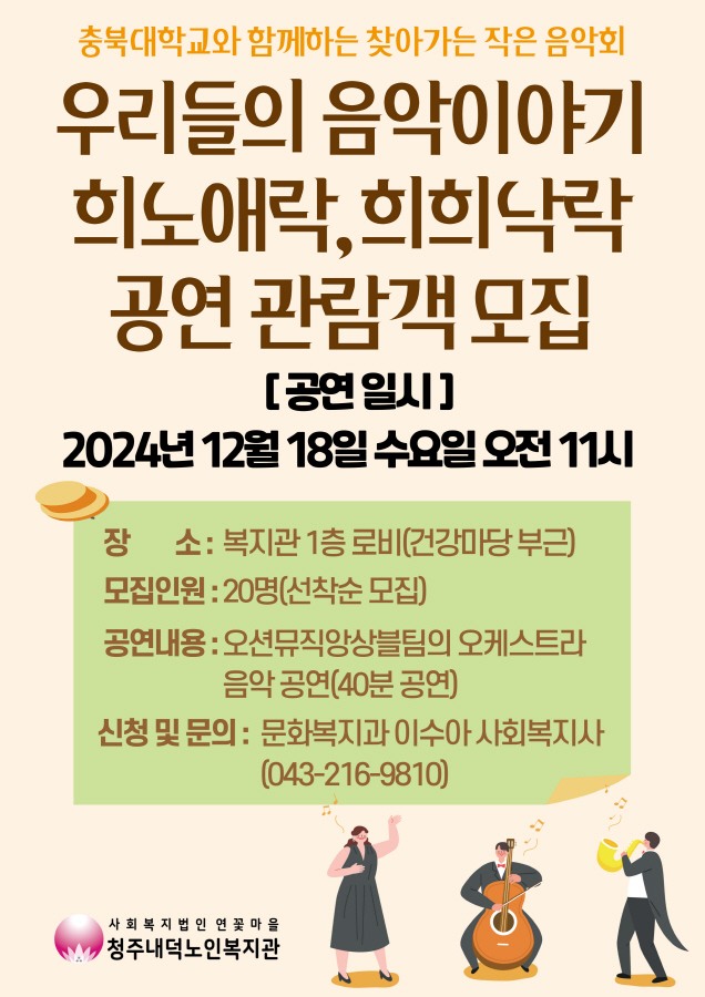 12월 18일 수요일 오전 11시 복지관 1층 로비 건강마당 부근에서 '우리들의 음악 이야기 희노애락, 희희낙락' 공연이 진행되어 관람객을 모집합니다. 이번 공연은 오션뮤직앙상블팀이 복지관에 방문해 오케스트라 음악을 들려줄 예정입니다. 많은 관심과 참여부탁드립니다!