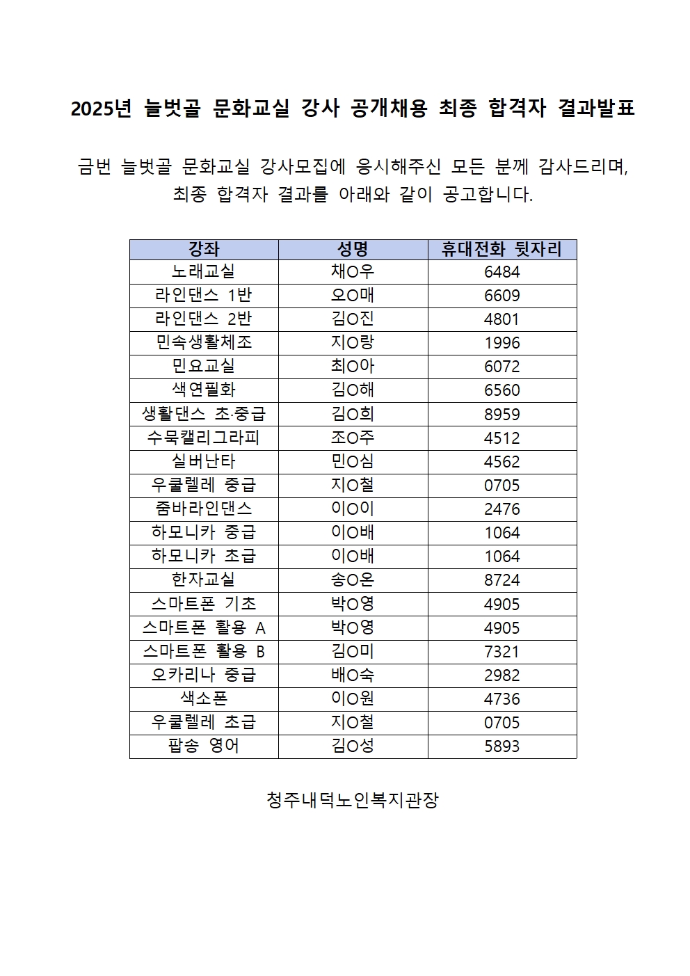 | 2025년 늘벗골 문화교실 강사 채용 공고 최종 합격자 발표 | |||