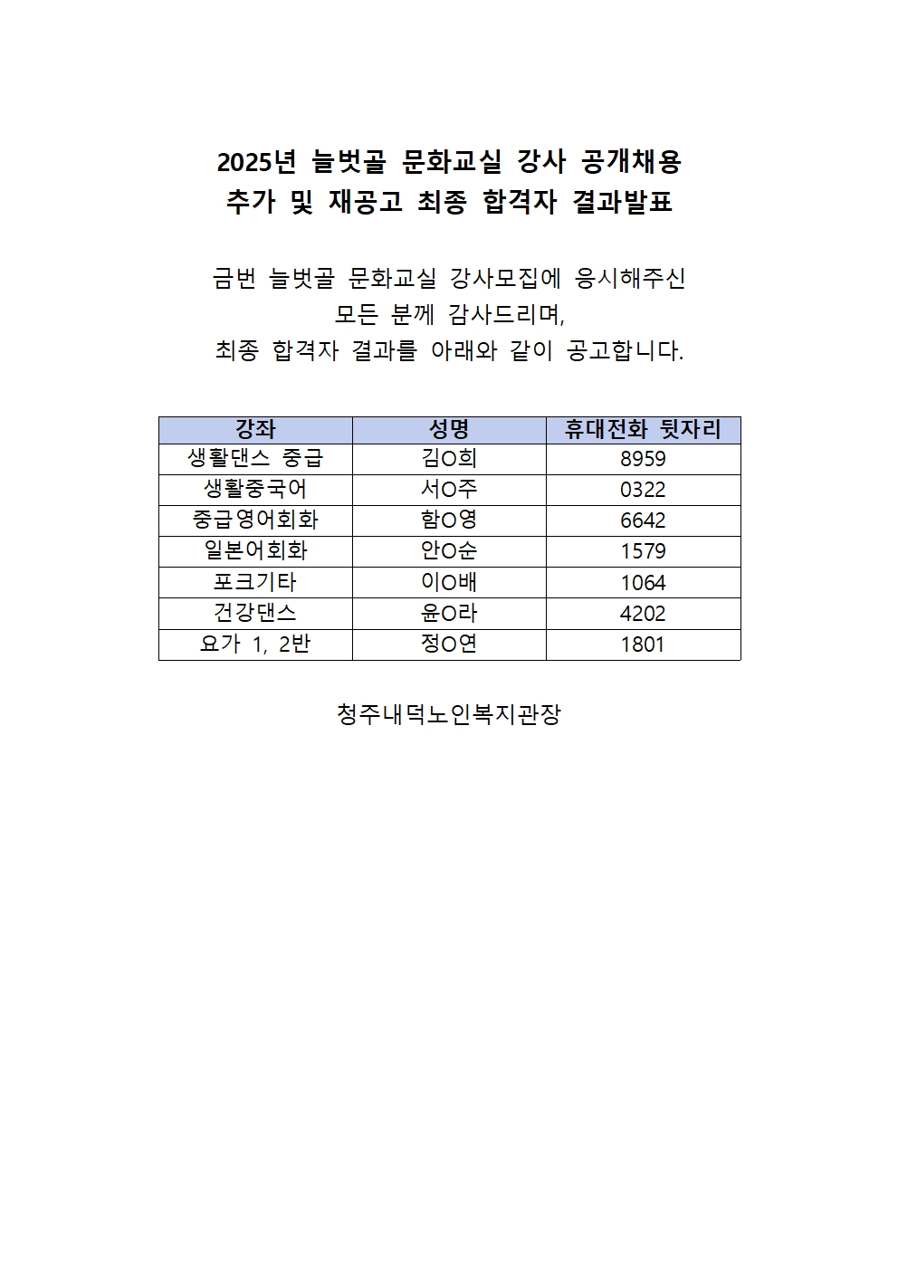 | 2025년 늘벗골 문화교실 강사 공개채용 추가 및 재공고 최종 합격자 발표 | |||