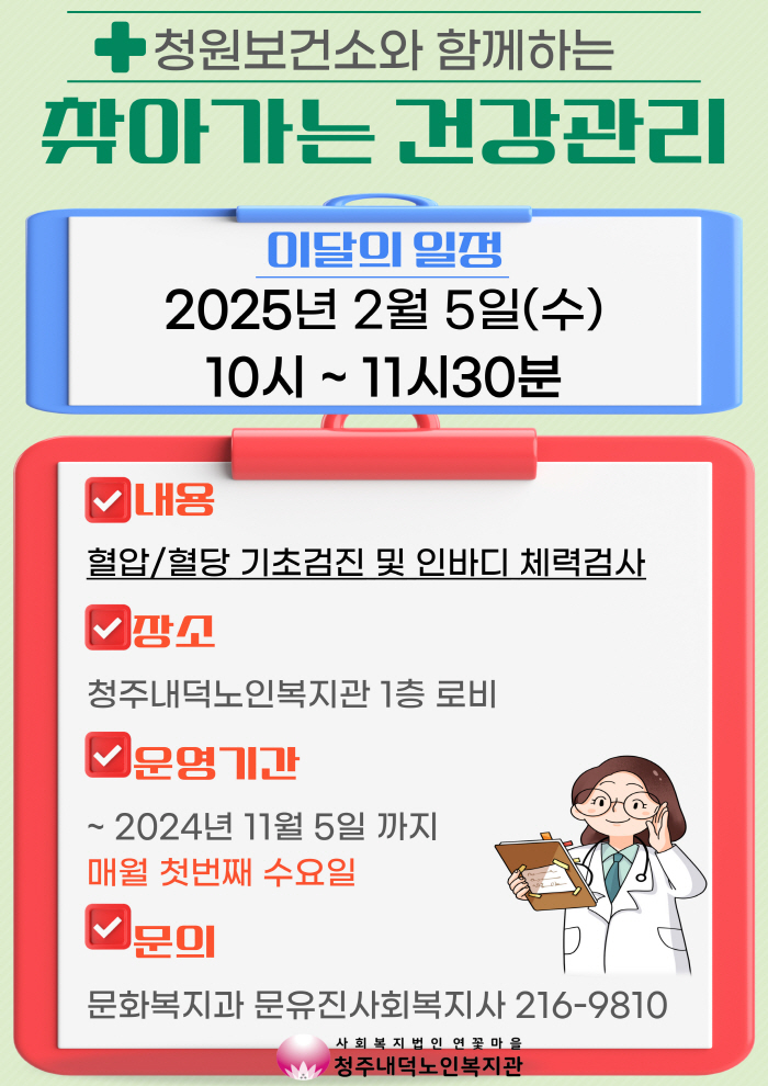청주내덕노인복지관에서는 2월 5일(수) 10시부터 11시30분까지 찾아가는 복지관 건강관리가 진행됩니다. |