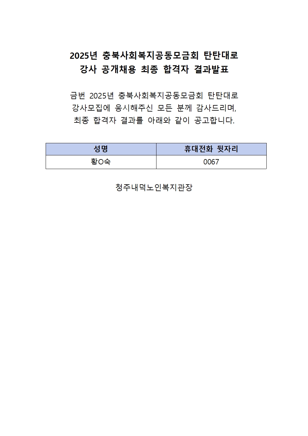 | 2025년 충북사회복지공동모금회 탄탄대로 강사채용 최종 합격자 결과 발표 | |||