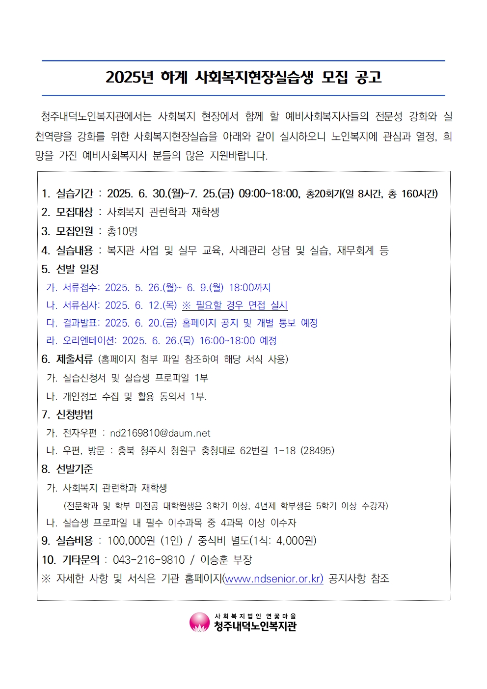 | 2025년 청주내덕노인복지관 하계 사회복지현장실습생 모집 공고 | |||