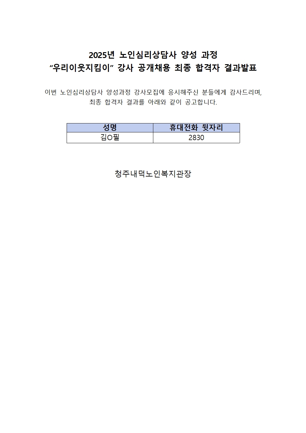 | 2025년 노인심리상담사 양성과정 강사 공개채용 최종 합격자 발표 | |||