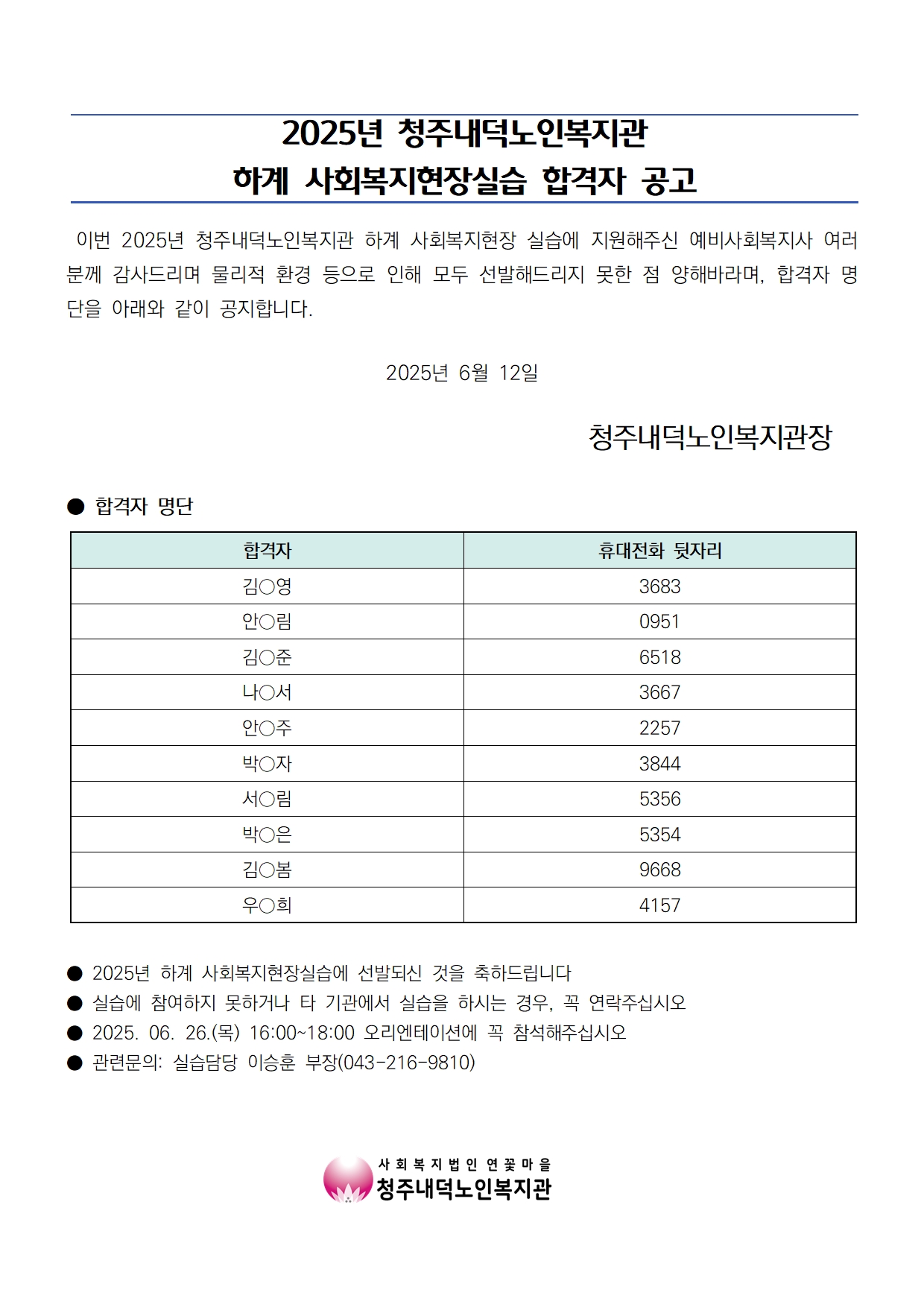 | 2025년 하계 사회복지현장실습 합격자 공고 | |||