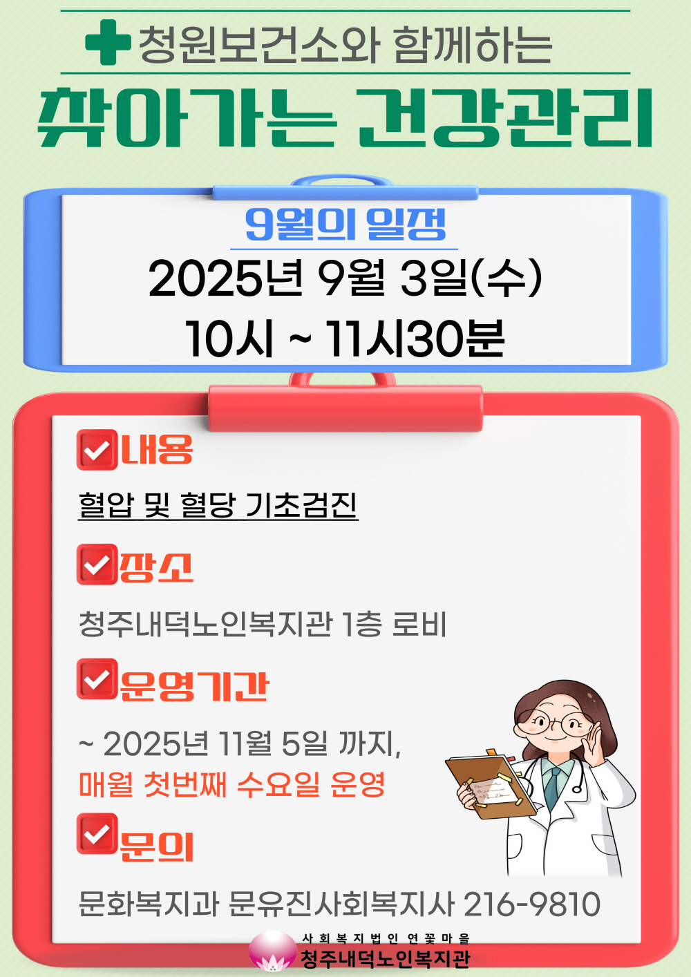 청주내덕노인복지관에서는 8월 한 달 쉬어갔던 찾아가는 복지관 건강관리가 9월 3일(수) 10시 다시 시작됩니다. 청원보건소와 함께 진행되며 혈압과 혈당검사가 진행됩니다. 사전접수가 아닌 당일 현장접수로 순차적으로 진행되며, 11시30분까지 진행되는 점 참고 부탁드립니다. 복지관 이용회원님들의 꾸준한 건강관리를 위해 찾아가는 복지관 건강관리는 11월까지 매월 첫번째주 수요일마다 진행되오니 일정에 참고바랍니다. 자세한 내용은 사진을 참고해주시고 문의사항은 문화복지과(043-216-9810) 문유진사회복지사를 찾아주세요. |