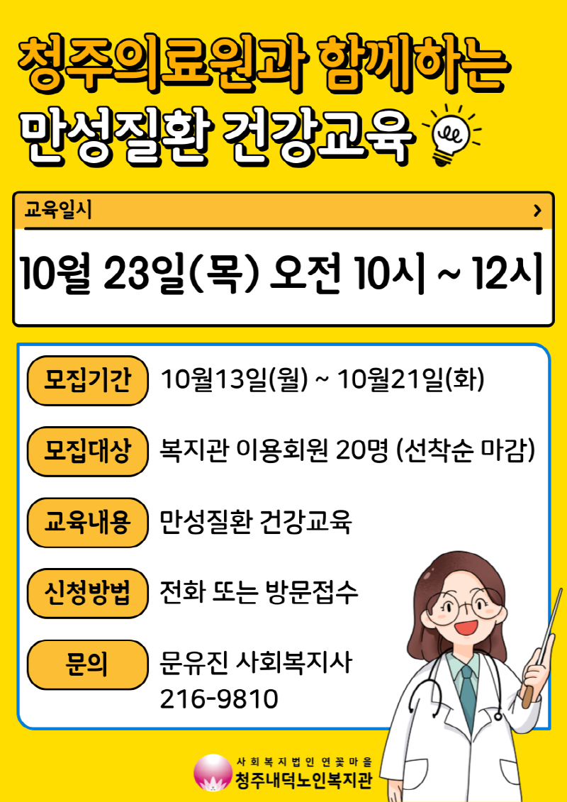 청주내덕노인복지관에서는 10월 23일(목) 10시 청주의료원과 함께 만성질환 건강교육이 진행됩니다. 참여자모집은 10월 21일까지 총 20명 선착순 마감으로 진행됩니다. 자세한 내용은 사진을 참고해주시고 문의사항은 문화복지과(043-216-9810) 문유진사회복지사를 찾아주세요.