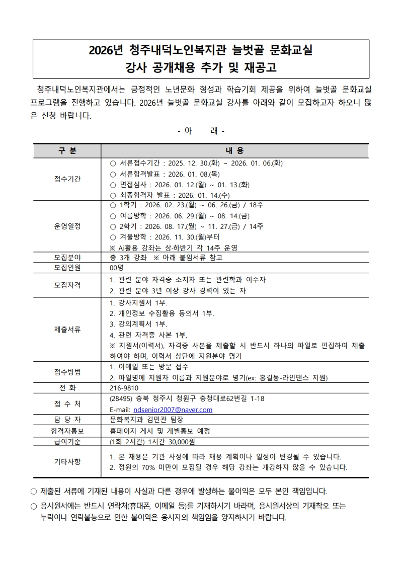| 2026년 늘벗골 문화교실 강사 채용 모집 추가 및 재공고 | |||