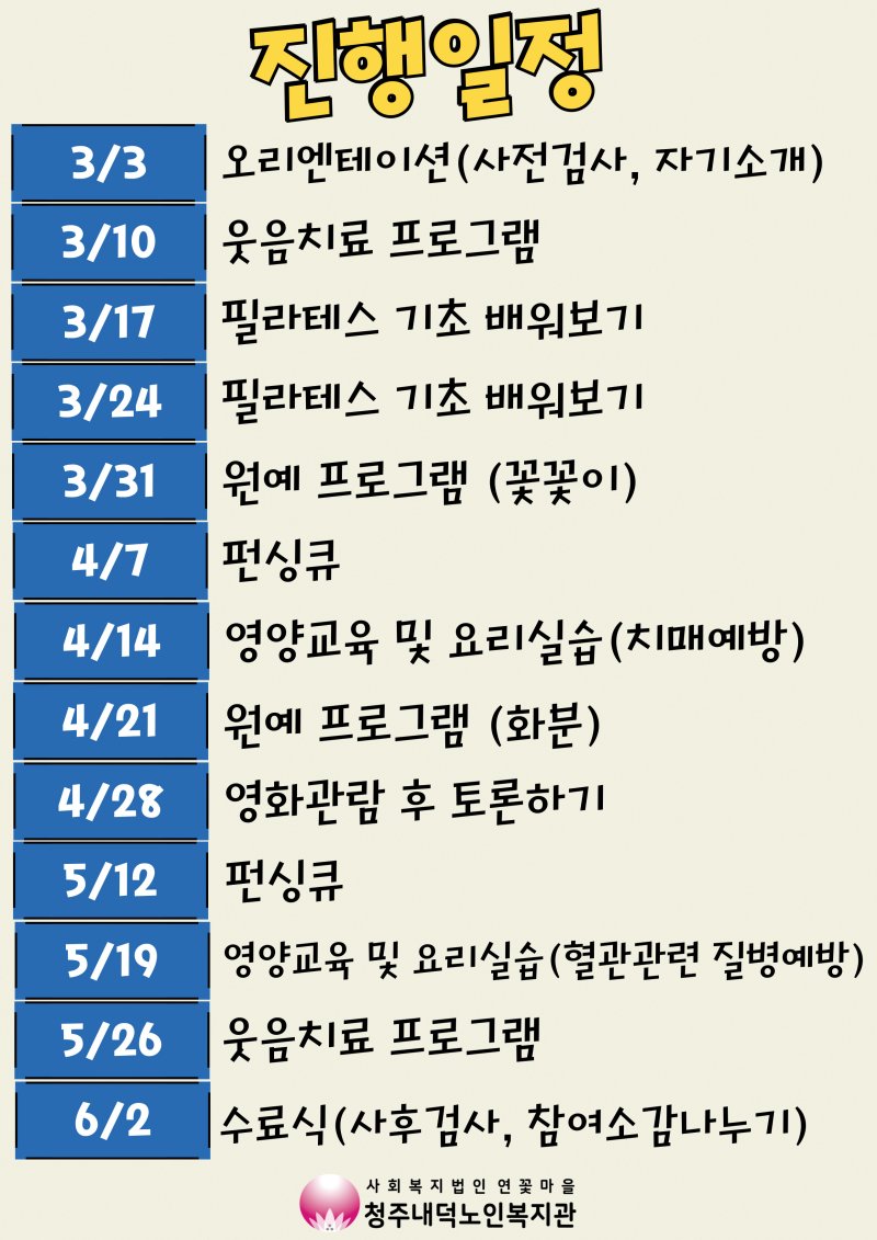 교육일시: 3월 3일(화)~6월 2일(화) / 매주(화) / 10시~12시 내용: 인지, 신체, 사회, 정서, 영양 등 5가지 영역별 치매 예방을 위한 프로그램 진행 대상: 복지관 이용회원 15명 선착순 모집 (신규 참여자 우선선발, 25년도 참여자는 후순위)