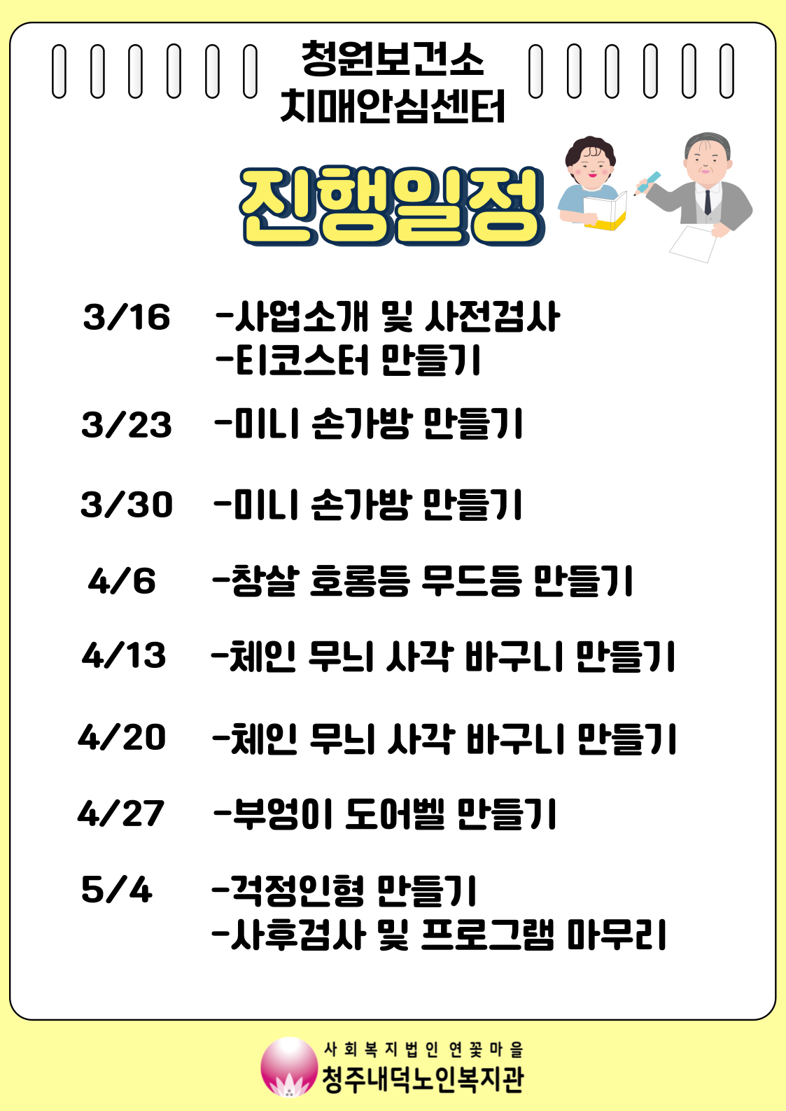교육일시: 3월 16일(월)~5월 4일(월) / 매주(월) / 14시~16시 내용: 인지선별검사, 재생종이공예활동을 통한 인지자극 프로그램 등 대상: 청원구 거주 복지관 이용회원 15명 선착순 모집 (신규 참여자 우선선발, 25년도 참여자는 후순위)