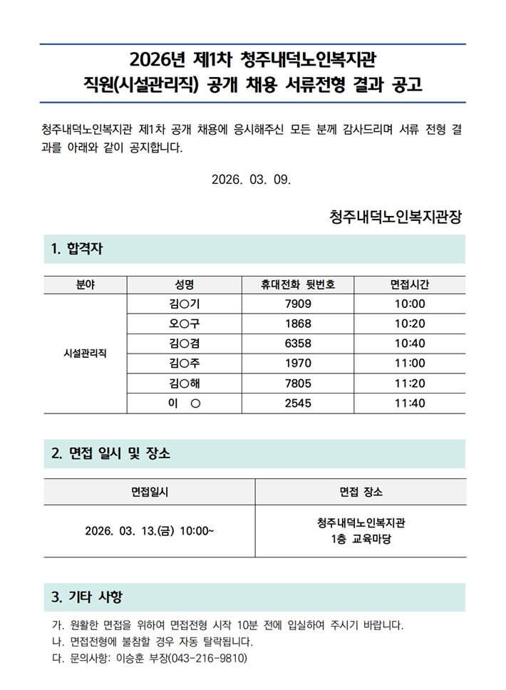 2026년 제1차 직원(시설관리직) 공개채용 서류전형 합격자 및 면접 안내