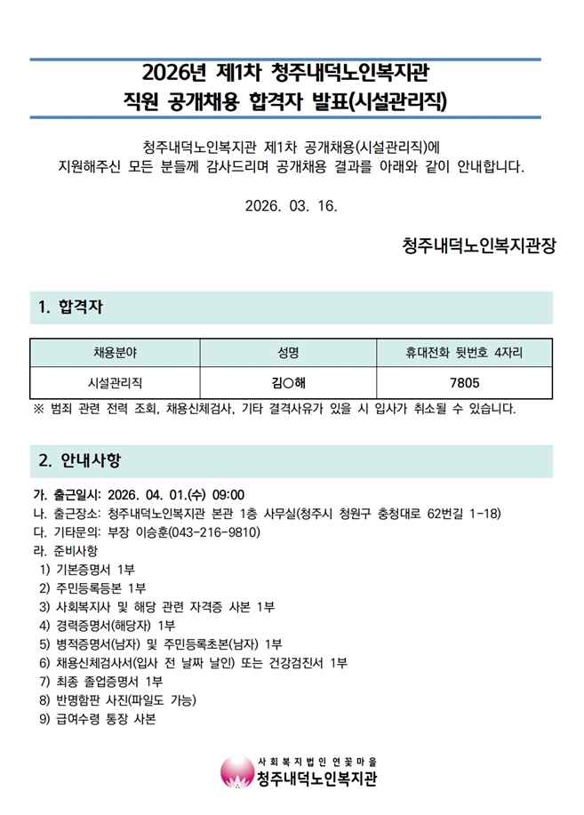 2026년 제1차 공개채용(시설관리직) 합격자 발표