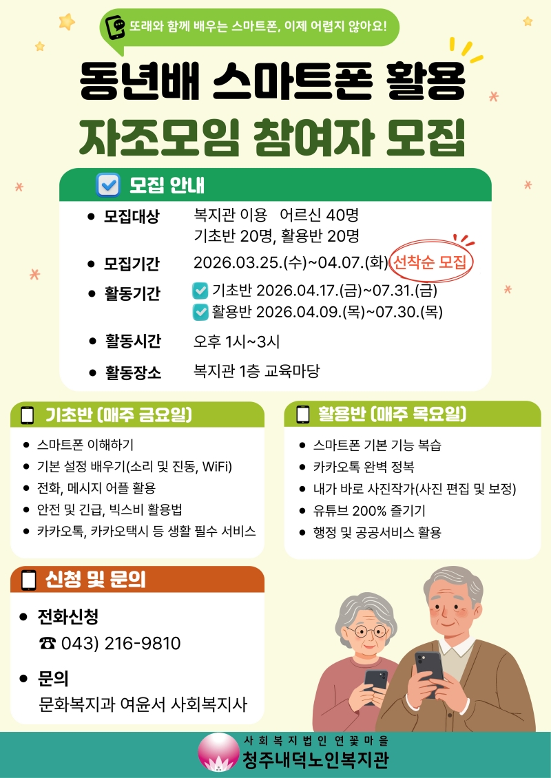 청주내덕노인복지관에서는 2026 상반기 동년배 스마트폰 활용 자조모임을 진행합니다.