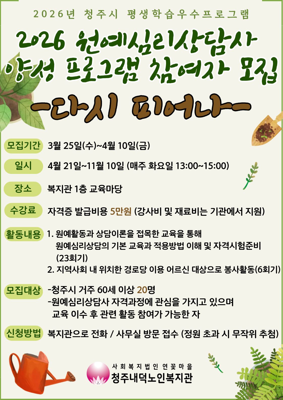 원예활동과 상담이론을 접목한 교육을 통하여 원예심리상담사 자격시험을 같이 준비하고, 추후 관련 활동(자조모임, 경로당 봉사활동 등)에 관심이 있으신 분들을 모집하오니,