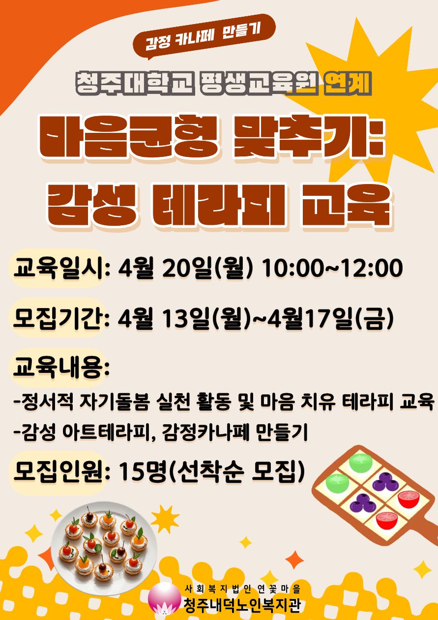 정서적 자기돌봄 실천 활동 및 마음 치유 테라피 교육 진행 후 감정 카나페 만들기를 실시할 예정입니다.