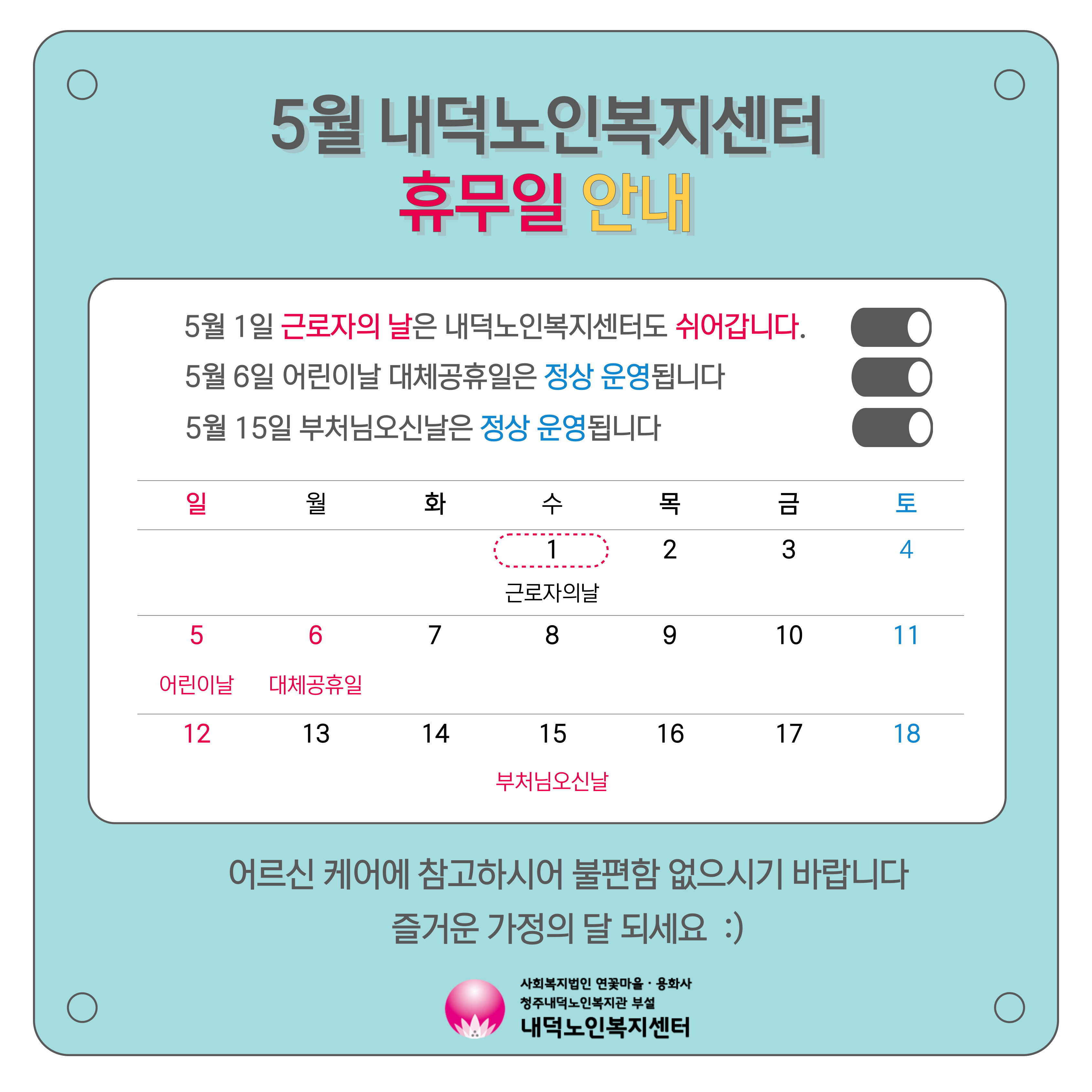 | 2024년 05월 휴무 및 대체공휴일 운영 안내 | |||