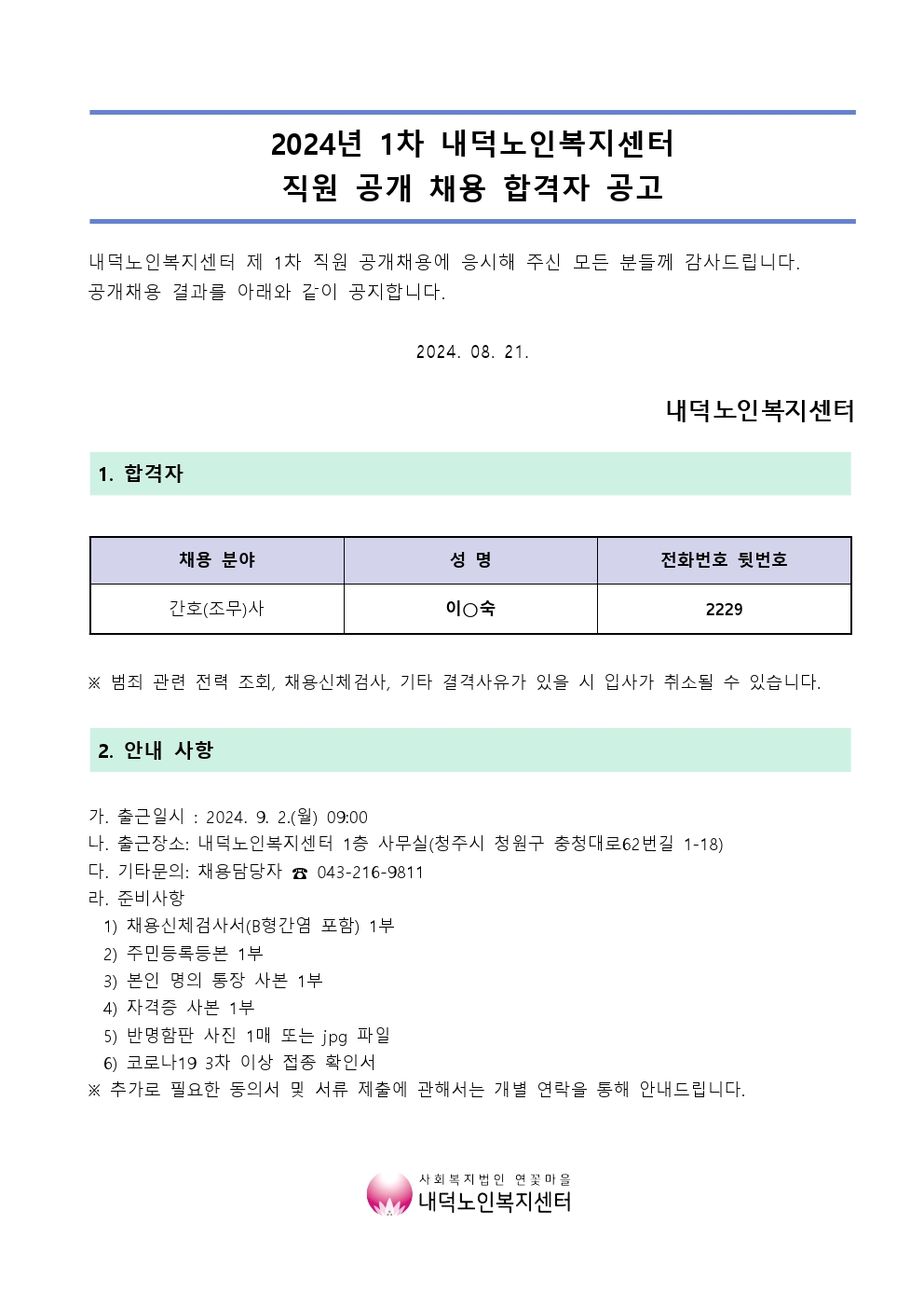 2024년 1차 내덕노인복지센터 직원 간호(조무)사 채용 최종 합격자 공고