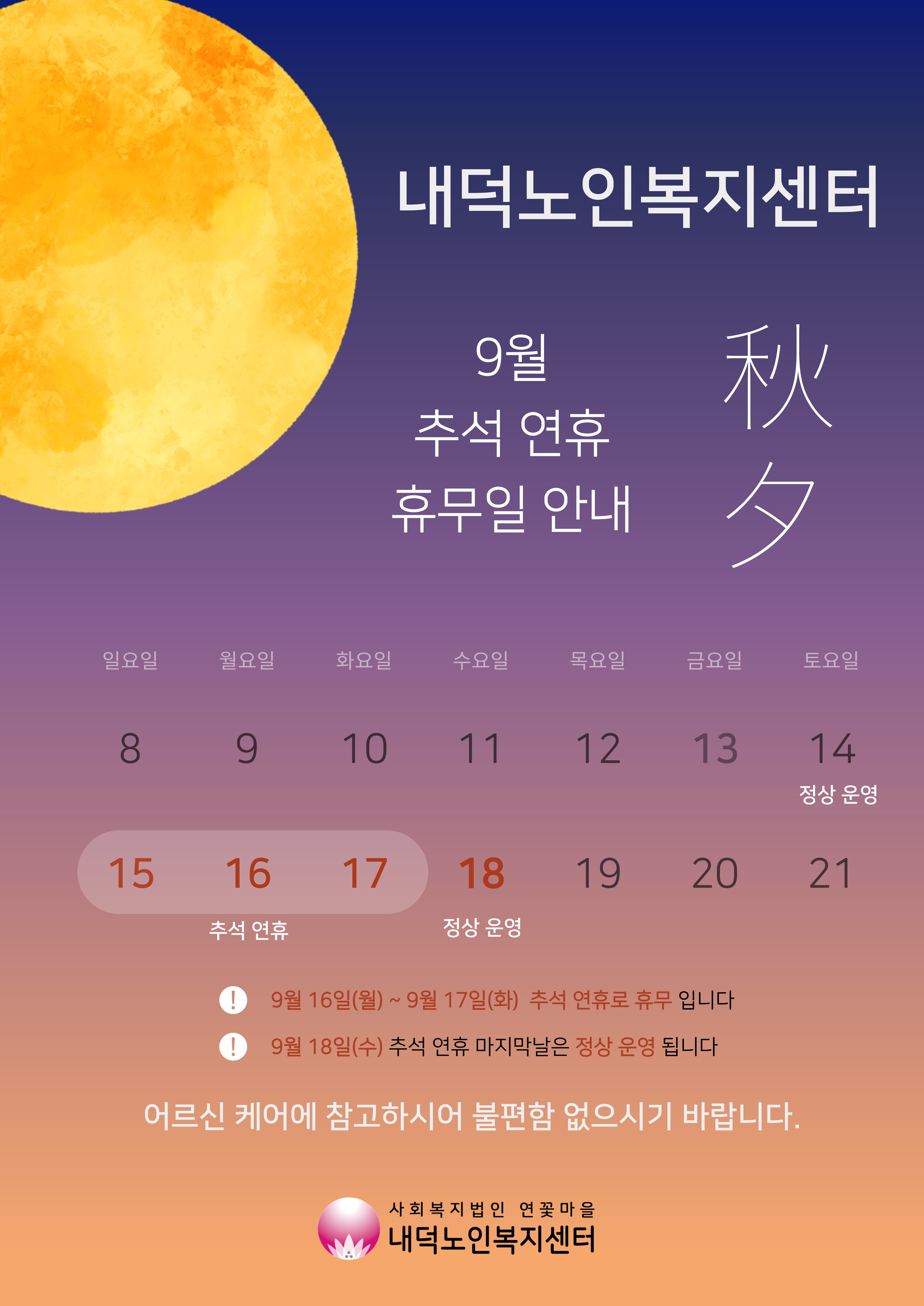 내덕노인복지센터 > 공지사항 - 2024년 09월 휴무일 운영 안내