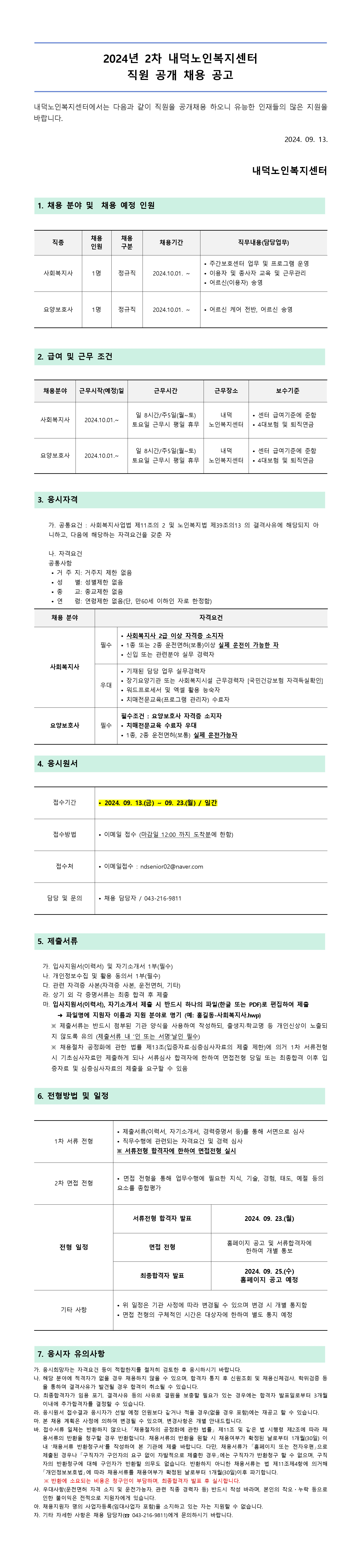 | 2024년 2차 내덕노인복지센터 직원(사회복지사 및 요양보호사) 채용 공고 | |||