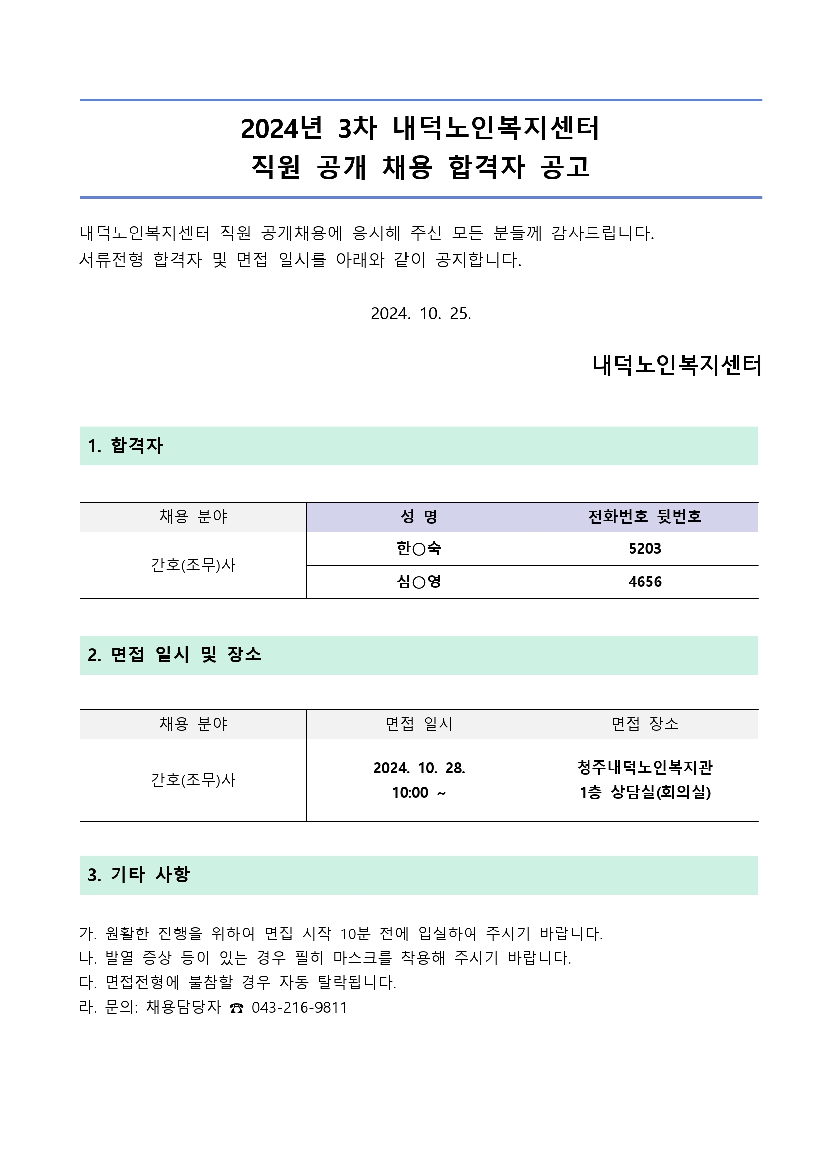 | 2024년 3차 내덕노인복지센터 직원 간호(조무)사 채용 공고 서류 전형 합격자 안내 | |||