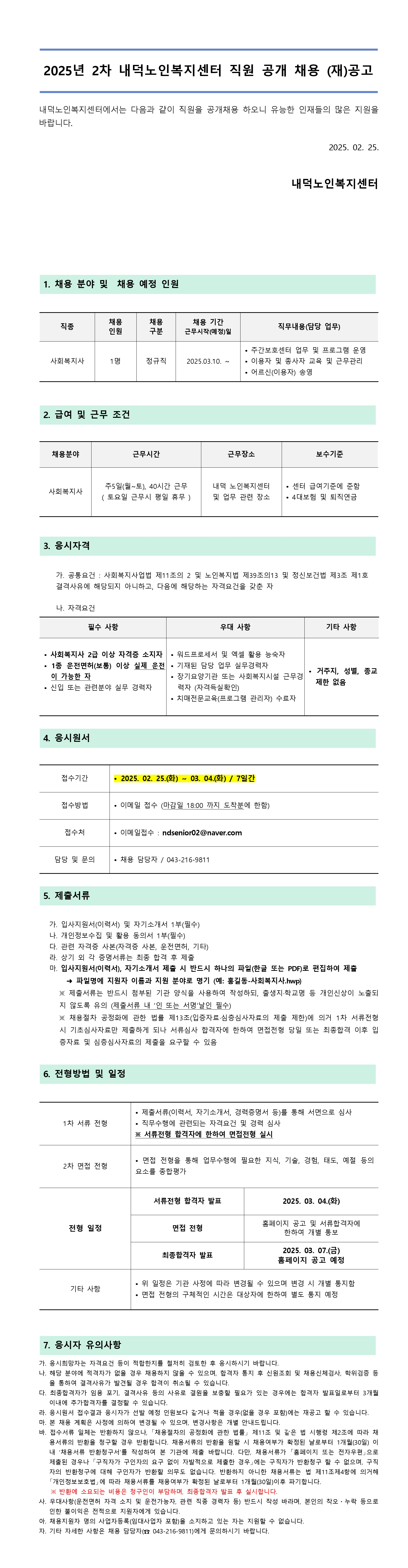 | 2025년 2차 내덕노인복지센터 직원 공개채용 (재)공고 | |||