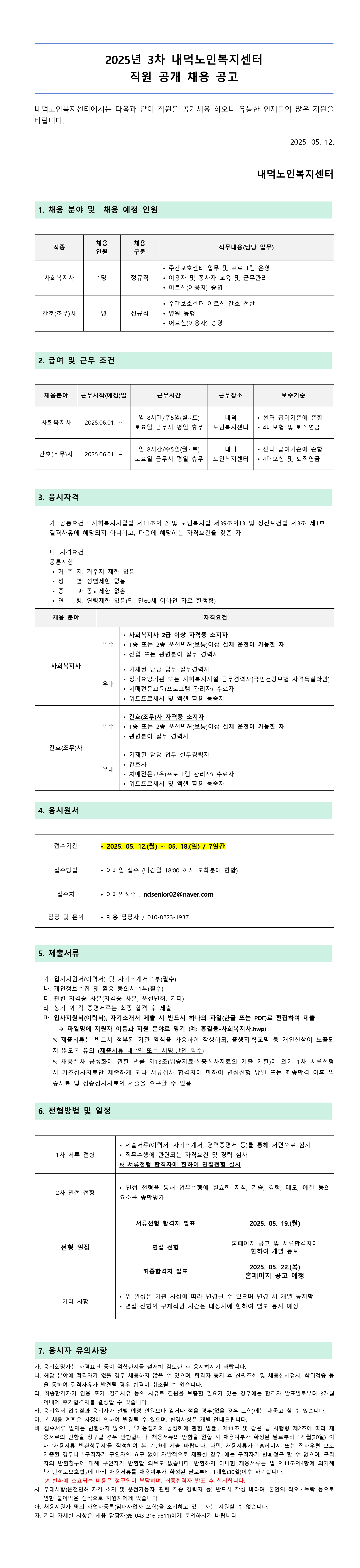 | 2025년 3차 내덕노인복지센터 직원 채용 공고 | |||