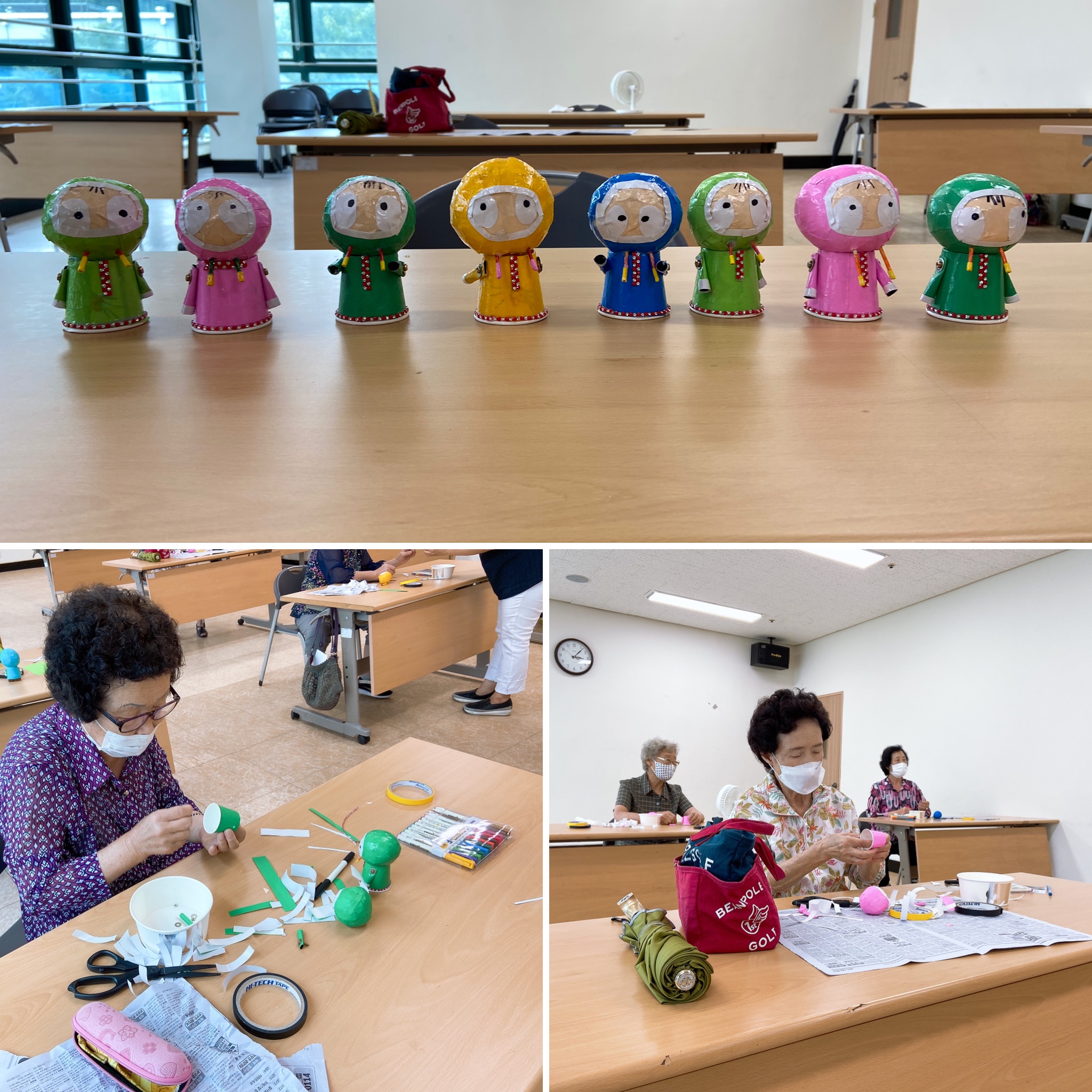 방역 수칙(발열체크, 거리두기, 마스크 착용 등)을 준수하며 노인 재능나눔 활동지원사업의 재활용공예 활동 소양교육을 진행하였습니다. 이번 주제는 에스키모 인형 만들기로 종이컵, 신문지 등의 친숙한 재료로 사용하였으며 추운 곳에 사는 에스키모인처럼 더운 여름철 아이들도 시원함을 느끼게 하고 싶어 어르신들께서 열심히 배우셨습니다.