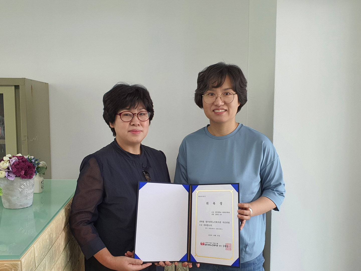 청주내덕노인복지관은 청주대학교 사회복지학과 김현진 교수님에게 자문위원 위촉장을 전달하였습니다.