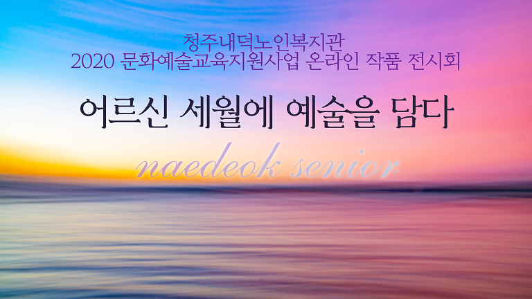 한국노인종합복지관협회와 한국문화예술교육진흥원이 지원하고 청주내덕노인복지관이 주최한 문화예술교육지원사업 온라인 작품 전시회 "어르신 세월에 예술을 담다" 를 개최합니다. 코로나19 여파 속에서도 어르신들의 문화예술교육지원사업 미술교실에 참여 의지가 대단하였는데요. 대면교육과 더불어 생소하게 느껴질 수 있는 온라인 교육에도 열심히 따라와주신 어르신들에게 힘찬 박수를 쳐드리고 싶습니다. 장기간 휴관하였음에도 불구하고 4점의 작품으로 빛을 내며 올해를 마무리 하게 되어 더욱 뜻 깊은 한 해가 된 듯 합니다. 어르신들 모두 수고 많으셨습니다~!