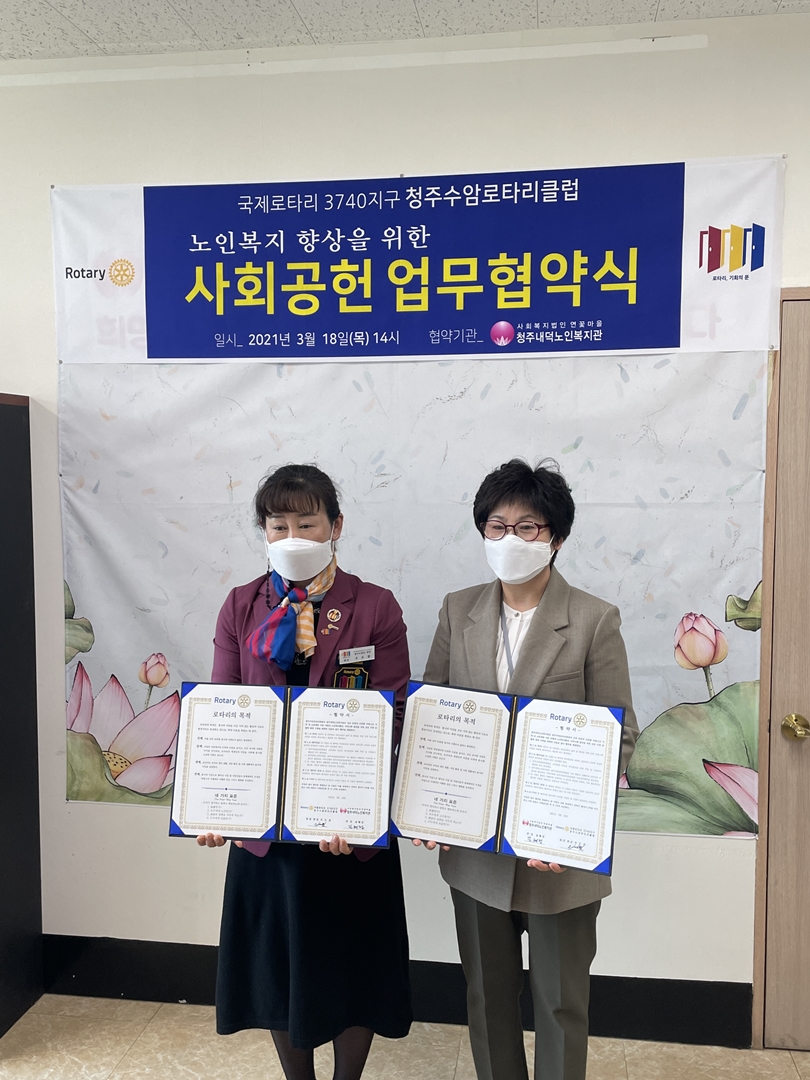 2021년 3월 18일(목) 청주내덕노인복지관(관장 길혜정, 사진 오른쪽)과 국제로타리 3740지구 청주수암로타리클럽(회장 우도겸, 사진 왼쪽) 두 기관이 지역사회 노인복지 향상에 기여하기 위해 함께 동행하기로 협약을 맺었습니다