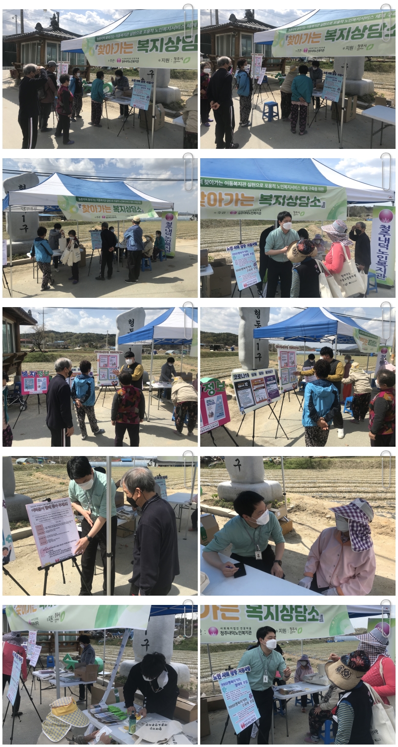 금일 14:00~16:00시까지 이동노인복지관사업 복지상담소를 내수읍 형동1리에서 청주행복네트워크와 함께 진행하였습니다~! 복지관 프로그램 운영 안내와 노인사회활동 지원사업 9988행복지키미 수요자 모집 안내, 저소득 어르신 신청 안내 등 전반적인 사업 안내를 실시하였으며 코로나19 관련 안전수칙 및 마을 어르신들과 지역주민들에게 마스크를 배부하였습니다. 행사를 진행하면서 거리두기 안내 및 마스크 착용 안내 등 방역수칙을 준수하면서 행사를 진행하였습니다~! 농촌지역 어르신들과 지역주민들을 위해 매달 복지상담소는 청원구 농촌지역을 찾아가겠습니다~!