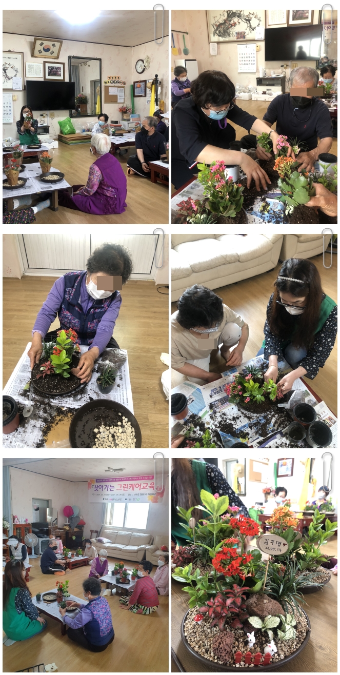 금일 14:00~16:00까지 내수읍에 위치한 형동1리 경로당에서 "찾아가는 그린케어교육" 2회기를 실시하였습니다~! 경로당 이용어르신 총 10명이 참여하여 원예교육(정원만들기)으로 진행되었으며, 흙과 손을 이용한 원예활동으로 어르신들의 치매예방활동에 많은 도움이 되었습니다~! 참여하신 어르신 모두 즐거워 하시며 프로그램을 마무리 할 수 있었습니다~! 오늘 참여해 주신 어르신들께 감사드리며, 원예활동교육을 지도해주신 강사님께도 감사드립니다^^ 앞으로도 농촌지역 어르신들의 건강과 행복을 위해 청주내덕노인복지관은 농촌지역을 꾸준히 찾아가 어르신들에게 힘이 되도록 노력하겠습니다~!