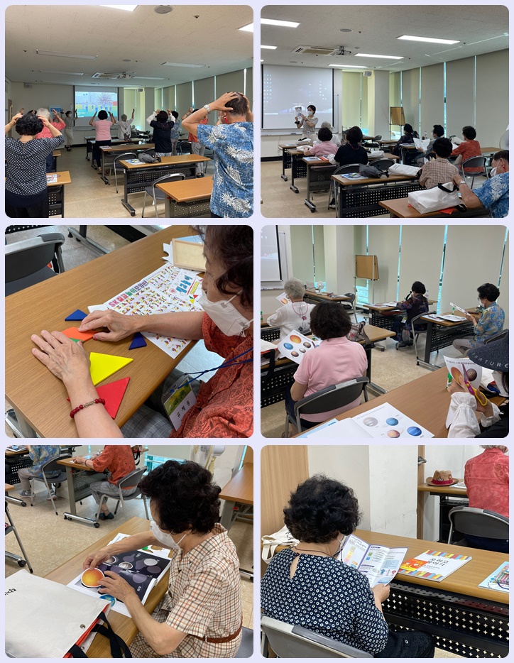 금일 복지관에서는 14:00~15:00, 복지관 2층 으뜸방에서 청원보건소 치매안심센터와 함께 찾아가는 치매예방인지강화교실 8회기(마지막회기)를 진행하였습니다! 이번 마지막 회기에서는 치매안심센터에서 배부해드린 '치매예방을 위한 가정인지학습' 자료를 활용하여 가정에서도 스스로 인지활동을 할 수 있도록 배우는 시간을 가졌습니다. 그리고 그와함께 지난시간에 설명했던 칠교놀이수업도 함께 진행했습니다.