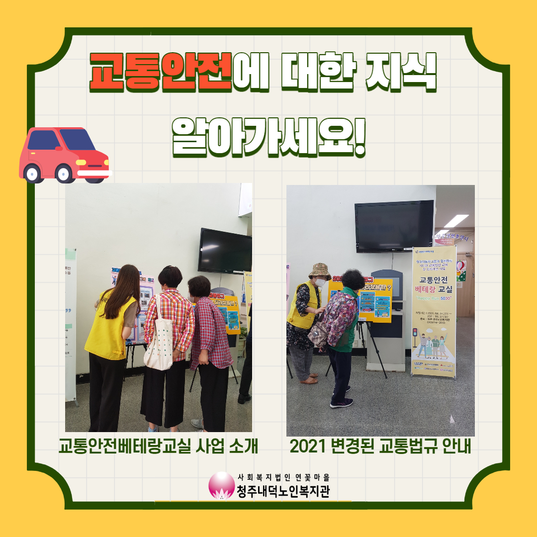 금일 저희 복지관에서는 13:00~15:00에 교통안전베테랑교실 교통안전 캠페인이 실시되었습니다! 교통안전베테랑교실 참여자들이 직접 2021 변경된 교통법규, 모니터링한 복지관 주변 위험지역, 교통안전표지판 설명 및 퀴즈 등을 복지관 이용자 어르신들에게 안내하여 교통안전지식을 전달하였습니다.