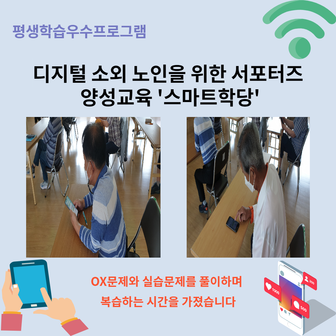 9월 14일 오전 10시 강당에서 스마트학당 참여자들이 스마트폰 경진대회를 실시하였습니다! 스마트폰 교육 받은 내용을 바탕으로 OX문제와 실습문제를 출제하여 문제풀이하며 복습하는 시간을 가졌습니다 스마트폰을 활용해 문제를 풀고 기념품도 나눠드리고 참여자들이 즐겁게 참여하였습니다 앞으로 스마트폰 서포터즈로 활동할 수 있도록 공부하며 배워가는 참여자들의 모습을 지켜봐주시기 바랍니다!