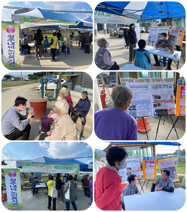 저희복지관에서는 지난 22일(금) 13:00~15:00까지 내수읍 형동1리 마을을 방문하여 찾아가는 복지상담소를 운영하였습니다~! 이번 복지상담소는 복지관 재가복지서비스 안내 및 제 5회 사랑의 김장김치나눔+one 캠페인 홍보 진행으로 진행되었으며 청주행복네트워크와 함께 지역사회 복지기관소식 안내 및 위기가구발굴 상담 등을 진행하였습니다~! 행사를 진행하면서 거리두기 안내 및 마스크착용 안내 등 방역수칙을 준수하면서 행사를 진행하였습니다! 농촌지역 어르신들과 지역주민들을 위해 매달 복지상담소는 청원구 농촌지역을 찾아가겠습니다!!