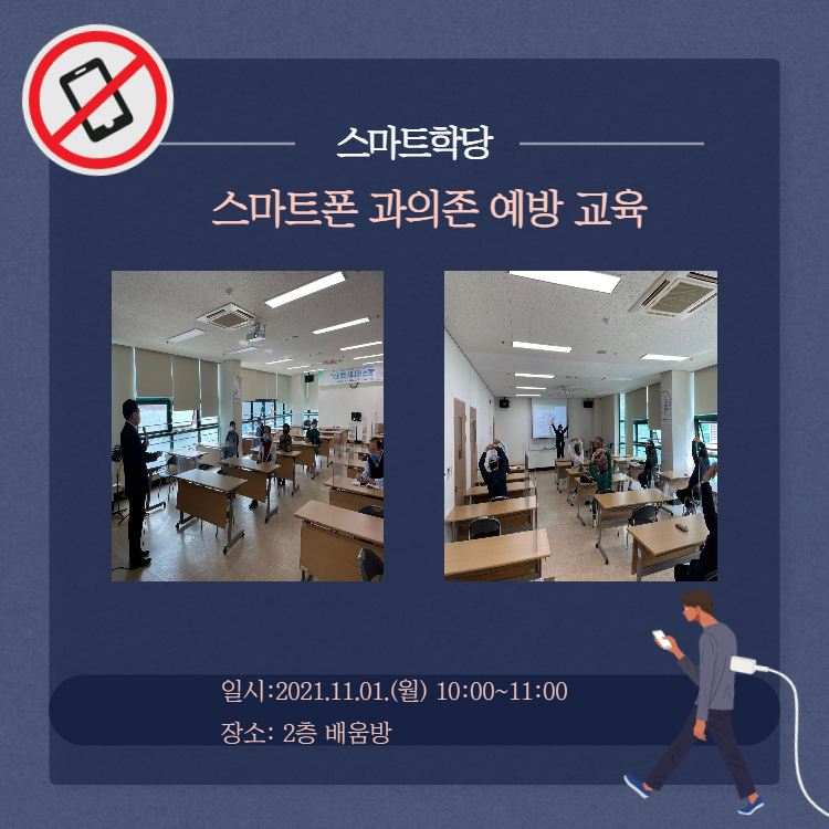 2021.11.01.(월) 10:00~11:00 복지관 2층 배움방에서 평생학습우수프로그램 스마트학당 참여자들 대상으로 서포터즈 양성교육 후 일상생활에서 스마트폰의 의존도가 늘어날 것을 예방하기 위해 스마트폰 과의존 예방 교육이 실시되었습니다. 충북스마트쉼센터 소속 박보규 강사님이 과의존의 정의와 개념, 문제점과 예방법 등을 교육해주셨습니다. 현재 사회에서 없어서는 안되는 필수품이 되어버린 스마트폰을 이번 교육을 통해 슬기롭고 올바르게 사용하는 현명한 서포터즈로 자리 잡을 수 있도록 여러분들의 많은 관심 부탁드립니다!