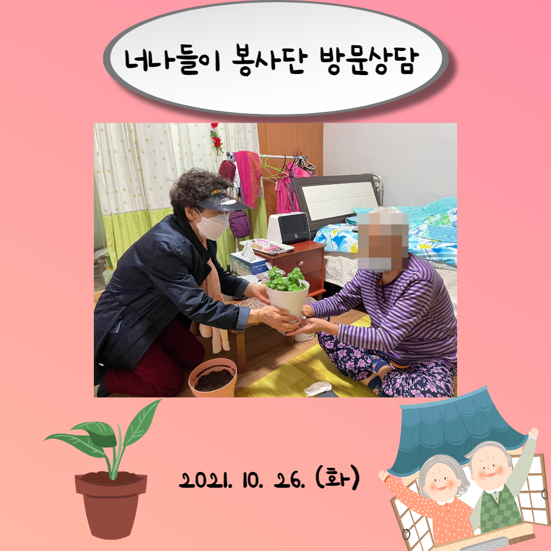 2021.10.25.~26. 너나들이 봉사단의 방문상담이 진행되었습니다. 너나들이 봉사단이 어르신들을 찾아뵈어 함께 반려식물을 화분에 옮겨 심고 전달 완료하였습니다. 코로나19로 인하여 혼자 있는 시간이 많은 요즘 시기 너나들이 봉사단이 찾아가 말벗이 되어줌으로서 긍정에너지를 전달하고 어르신이 즐겁고 행복한 하루를 보낼 수 있도록 노력하겠습니다! |
