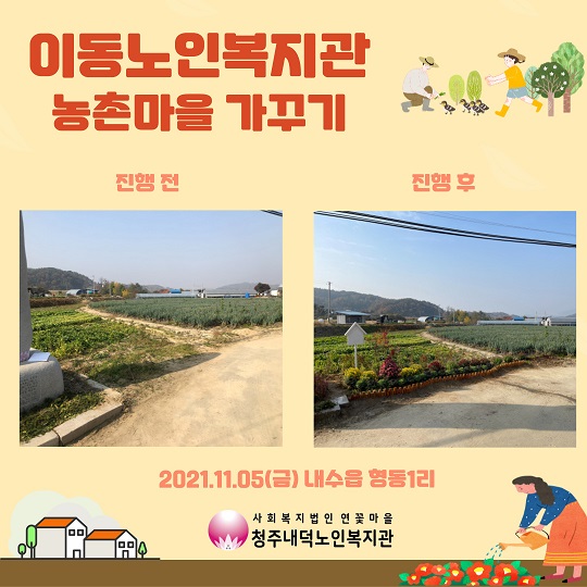 저희 복지관에서는 11월 5일(금) 13:00~16:00까지 이동노인복지관사업 일환으로 농촌마을 가꾸기 프로젝트를 진행하였습니다~! 이번 프로젝트는 형동1리 마을로 선정하여 마을회관 앞 꽃밭정원을 만드는 것으로 어르신들과 협의하여 진행하게 되었습니다! 해당 마을 어르신들의 적극적인 참여와 주제 선정부터 장소 선정까지~~~모두 어르신들과 함께 논의하여 진행하였습니다~! 꽃밭정원 관리부터 유지보수까지 모두 해당 마을 주민들과 어르신들이 직접 하시며, 마을을 위해 모두 노력하시기로 하였습니다^^ 이번 농촌마을 가꾸기 프로젝트를 위해 큰 도움을 주신 마을이장님과 노인회장님~!!! 너무 감사드리며, 함께 참여한 직원분들 모두 수고많으셨습니다~!^^