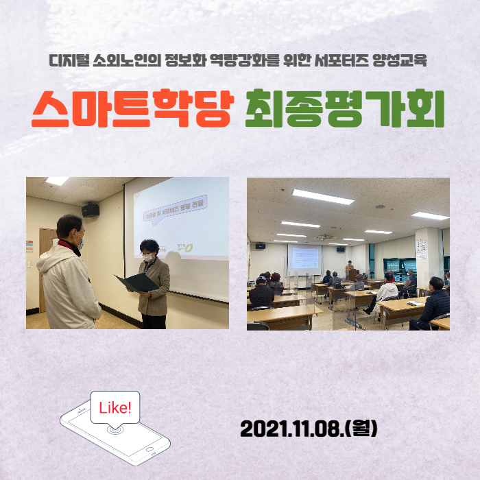 지난 4월부터 진행된 스마트학당은 디지털 소외노인의 정보화 역량강화를 위한 서포터즈 양성교육 과정으로 참여자들은 향후 디지털기기 교육에 있어 보조강사 및 동년배 서포터즈로 활동하게 됩니다. 아직 부족한 부분이 많지만 더욱 공부하여 디지털 소외노인들에게 도움이 될 수 있도록 하겠습니다. 많은 관심과 응원 부탁드립니다!