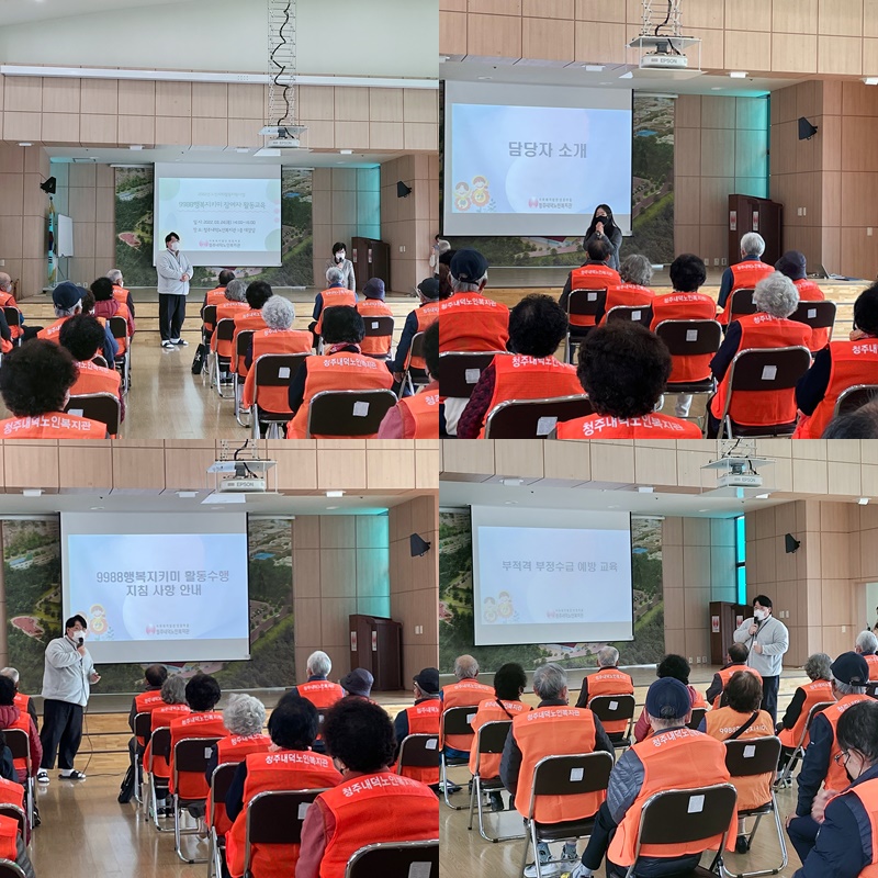 청주내덕노인복지관에서는 3월 24일 목요일 오후 2시부터 4시까지 2시간 동안 1층 대강당에서 9988행복지키미 참여자 43명을 대상으로 활동교육을 실시하였습니다. 노인사회활동지원사업의 개요 및 9988행복지키미 활동 지침 사항들을 안내함으로써 참여자들이 사업의 취지를 이해하고 활동 수행 태도를 점검할 수 있는 계기를 마련하였습니다. 또한 부적격·부정수급 예방 교육을 통해 활동시 지켜야 할 자격 사항에 대하여 숙지할 수 있도록 하였습니다. 앞으로도 활동교육을 통하여 9988행복지키미 참여자들이 사명감과 책임감을 갖고 활동을 적극적으로 수행할 수 있도록 하겠습니다! ※ 참여자 전원 발열체크와 손소독을 실시하였으며, 2M 이상 거리두기, KF94마스크 확인 등 방역수칙을 잘 준수하여 교육 진행하였습니다. |