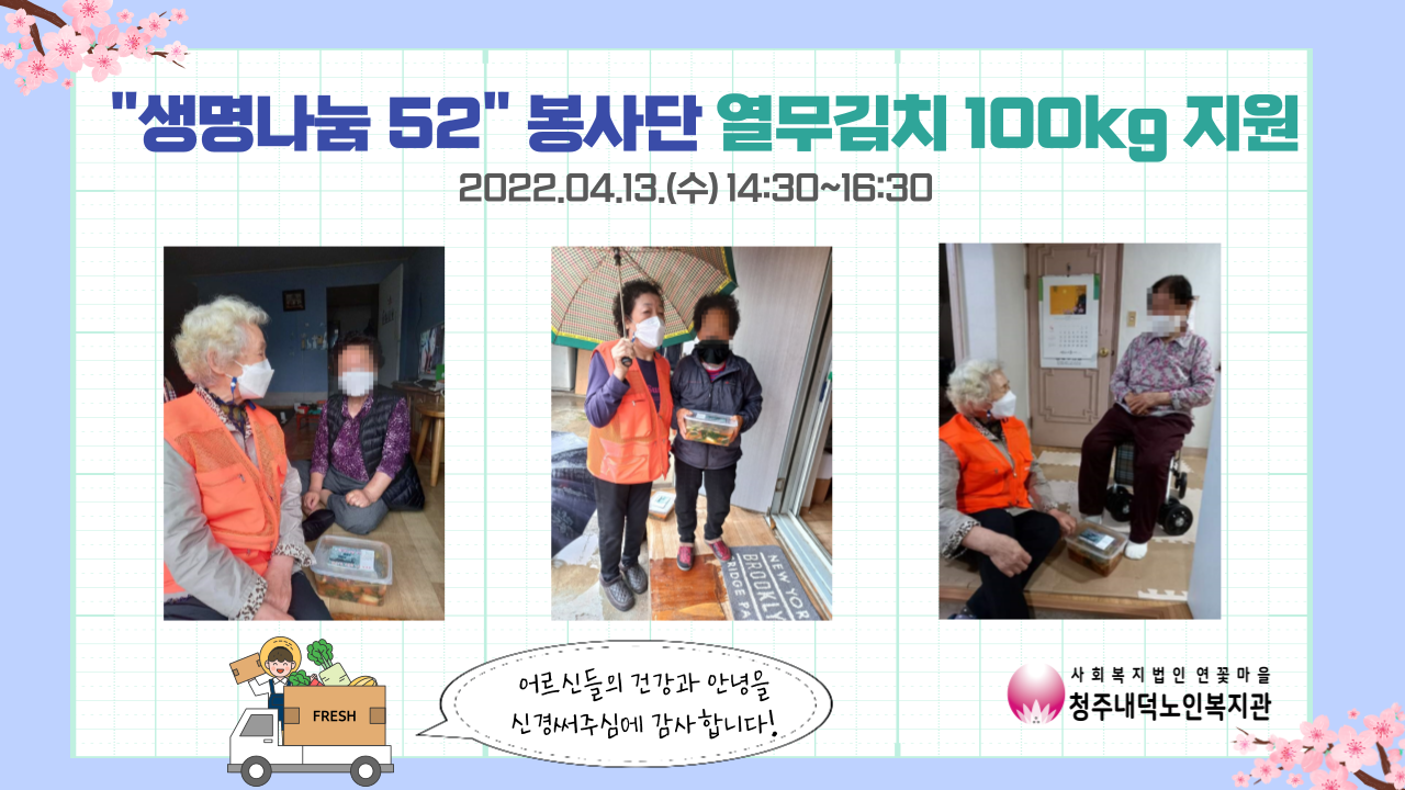 청주내덕노인복지관에서는 4월 13일 수요일 "생명나눔52"에서 지원해주신 열무김치 100kg를 저소득 재가어르신 댁으로 신속하게 전달해드렸습니다! 지역사회 어르신들을 위해 신경써주심에 감사드립니다! |