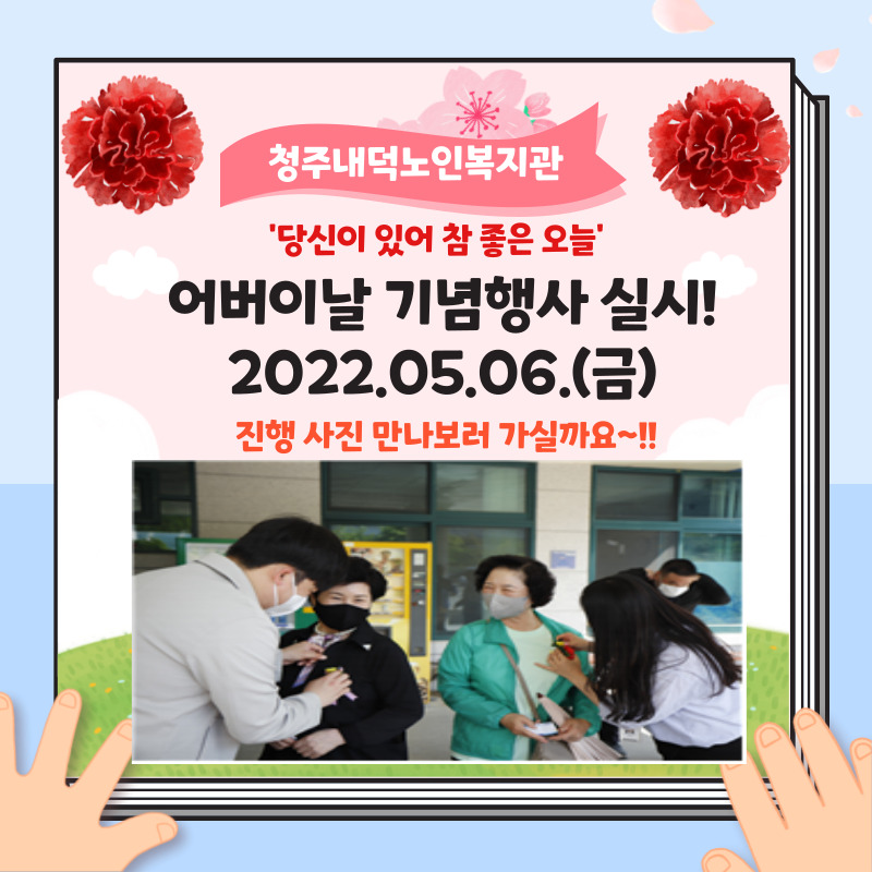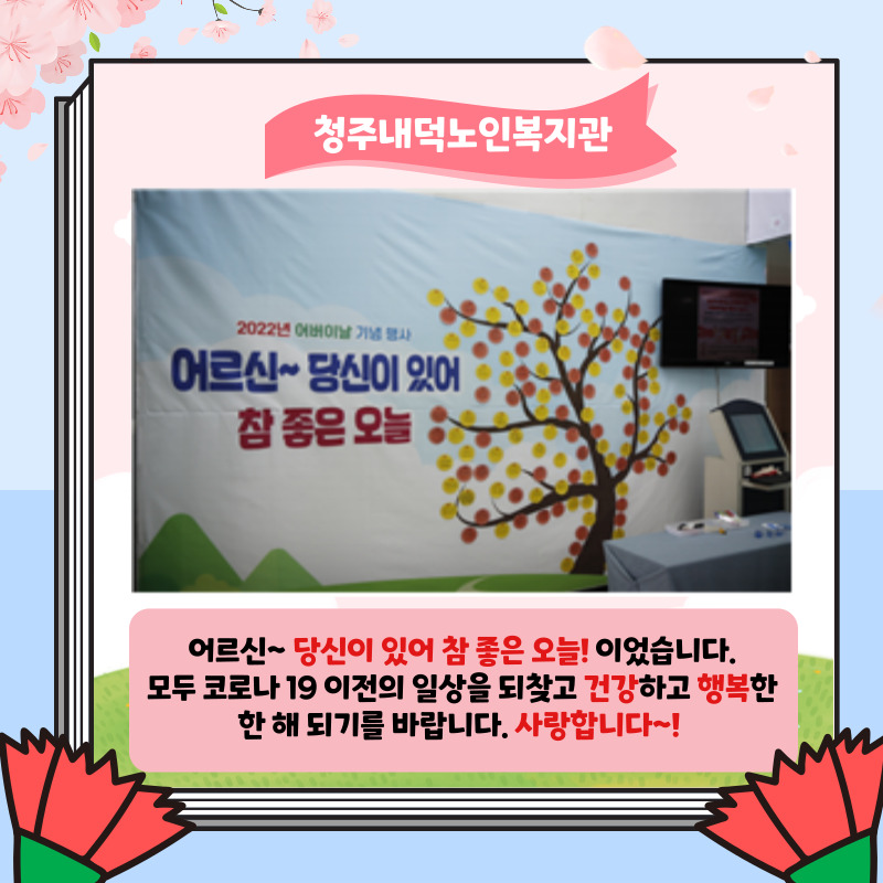 이번 행사가 성황리에 개최될 수 있도록 지원해주신 동청주신협, 우리들기업, 유심초 등 기업 단체와 봉사 단체들에게 모두 감사드리며 앞으로도 희망과 행복의 100세 시대를 위해 노력하는 복지관이 되겠습니다~! 다시 한 번 어버이날을 축하드립니다~!!♥
